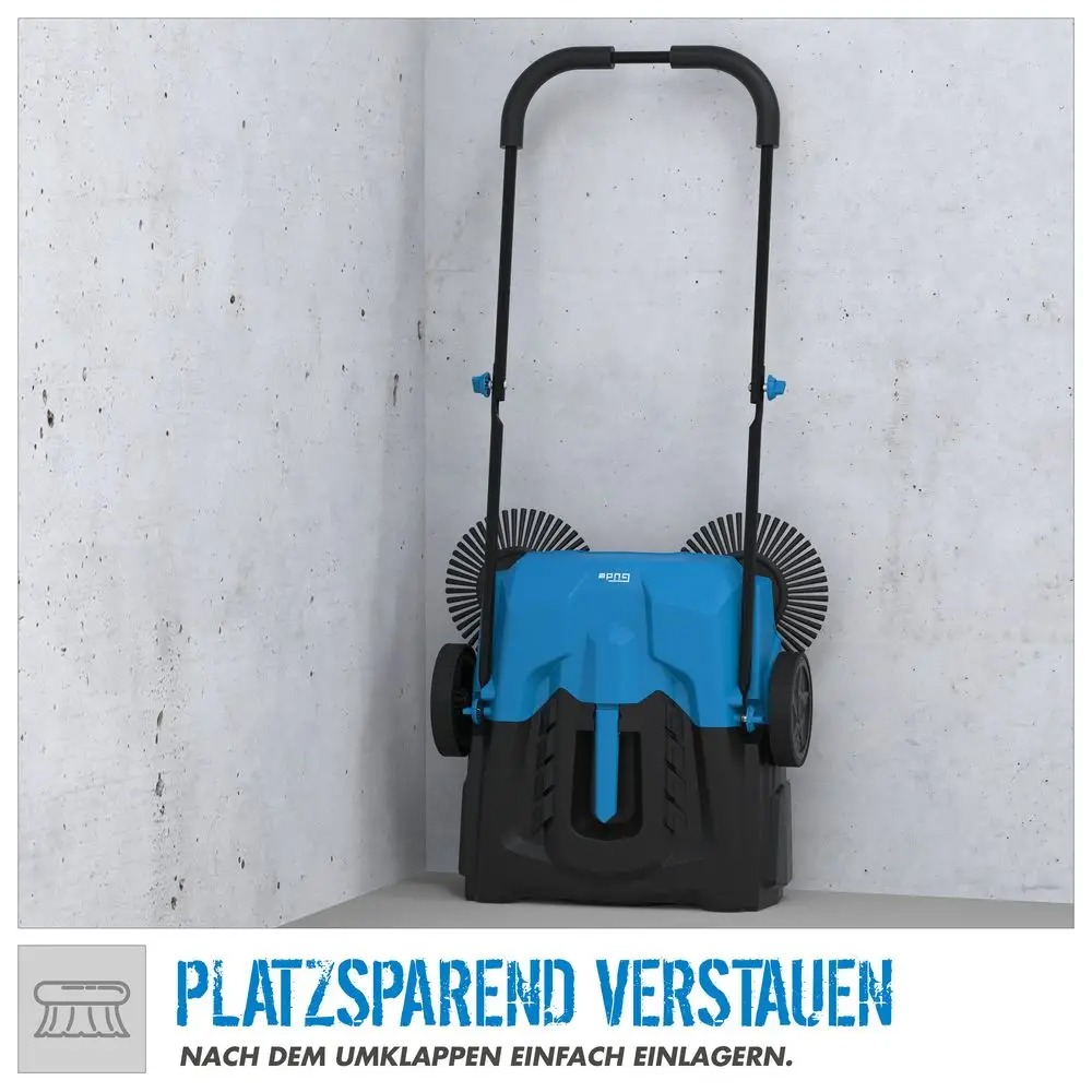 Güde GKM 650 fejemaskinen er den perfekte løsning til at holde dine områder omkring huset rene. Ved at køre fejemaskinen frem over snavset, kan fejemaskinen opsamle blade, snavs og smådele i opsamlingsbeholderen. Huset er lavet af højkvalitets plastik. På grund af de to roterende sidekoste, som betjenes med gummiremstræk, sikres en stor fejebredde. Med det drejelige hjul kan der opnås perfekt fejeydelse selv i kurver. De store drivhjul sikrer fleksibel drift af enheden, selv under våde forhold. Kørestangen er foldbar og fylder derfor ikke meget under opbevaring.