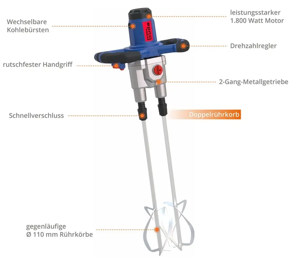 Güde GRW 1811.1 TWIN røreværk repræsenterer en professionel og kraftfuld maling røremaskine specielt designet til effektiv omrøring og blanding af maling og dispersioner. En af dens enestående egenskaber er den forcerede blandingseffekt, som sikrer perfekt blanding af komponenterne. Denne effekt har også den fordel, at den reducerer blandetiden med op til 50 %, hvilket igen betyder betydelige tidsbesparelser. Under udviklingen blev der lagt særlig vægt på arbejdskomfort. Dette afspejles i de ergonomisk designede håndtag med softgrip-støtte, som ikke kun sikrer komfortabel håndtering, men også minimerer den krævede indsats. Et andet højdepunkt er, at de modsat roterende omrørere kompenserer for rotationsbevægelser, så der ikke er omvendt drejningsmoment. Dette sikrer et jævnt og kontrolleret arbejde. Det robuste og holdbare metalgearhus lover en lang levetid for enheden. For præcis kontrol er en elektronisk hastighedsregulator integreret direkte i håndtaget. 2-trins gearkassen tillader forskellige hastigheder, alt efter behov. Softstartfunktionen sikrer en jævn start af røreværket. Og med et 3,7 m langt, fleksibelt gummikabel H07RN-F er du næppe begrænset i din bevægelsesfrihed. Med GRW 1811.1 TWIN får du en omrører, der overbeviser med hensyn til effektivitet, komfort og holdbarhed.